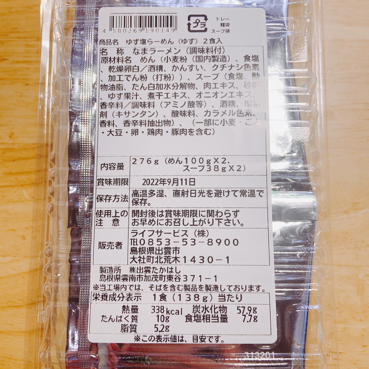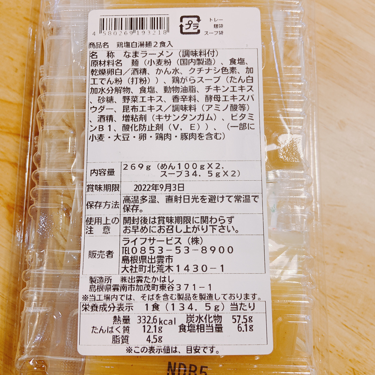 原材料 | ▼鶏塩白湯麺:めん:小麦粉(国内製造)、食塩、乾燥卵白/酒精、かんすい、クチナシ色素、加工でん粉、(打粉)、スープ:鶏がらスープ、たん白加水分解物、食塩、動物油脂、チキンエキス、砂糖、野菜エキス、香辛料、酵母エキスパウダー、昆布エキス/調味料(アミノ酸等)、酒精、増粘剤(キサンタン)、ビタミンB1、酸化防止剤(、E)、(一部に小麦・大豆・卵・鶏肉・豚肉を含む)▼支那そば:めんめん:小麦粉(国内製造)、食塩、乾燥卵白/酒精、かんすい、クチナシ色素、加工でん粉、(打粉)、スープ:醤油、食塩、砂糖、動物油脂、植物油脂、ぶどう糖、香辛料、肉エキス、煮干しエキス、酸母エキス、玉ねぎ、かつお節粉末/調味料:カラメル色素、酸味料、酸化防止剤、(一部に小麦・大豆・卵・鶏肉・豚肉を含む)▼ゆず塩拉麺:めん:小麦粉(国内製造)、食塩、乾燥卵白/酒精、かんすい、クチナシ色素、加工でん粉、(打粉)、スープ:食塩、動物油脂、たん白加水分解物、肉エキス、砂糖、ゆず果汁、煮干しエキス、オニオンエキス、香辛料/調味料(アミノ酸等)、酒精、増粘剤(キサンタン)、酸味料、カラメル色素、香料、香辛料抽出物(一部に小麦・ごま・大豆・卵・鶏肉・豚肉を含む) |