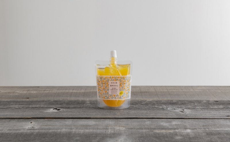 温州みかん果汁に、国産の粗糖、粉寒天、こんにゃく粉を加え、ゆるく固めた飲むゼリーです。